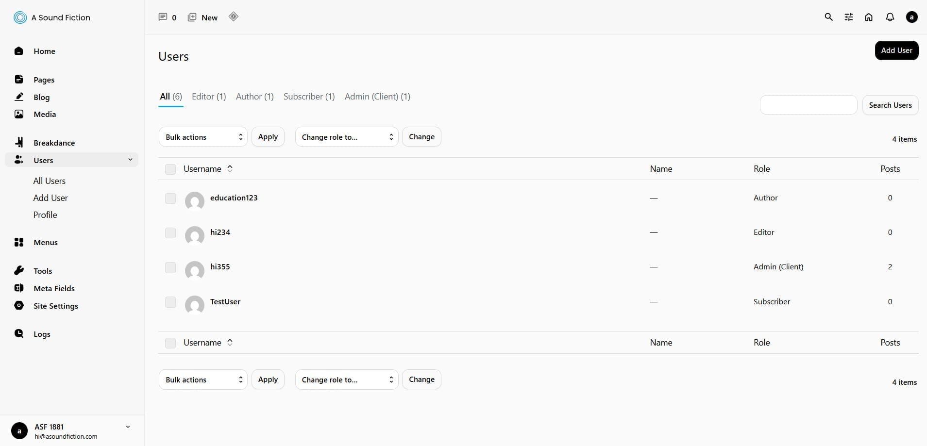 Admin (Client): The most powerful role with full access to site management. Can manage pages, posts, users, menus, and design.