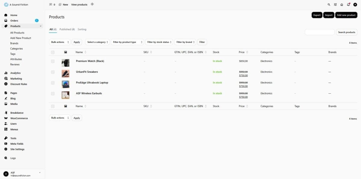 You can manage all your products from the “Products” menu in the admin panel. From here you can add and edit products, assign categories, match brands, add tags, set attributes, and manage customer reviews.