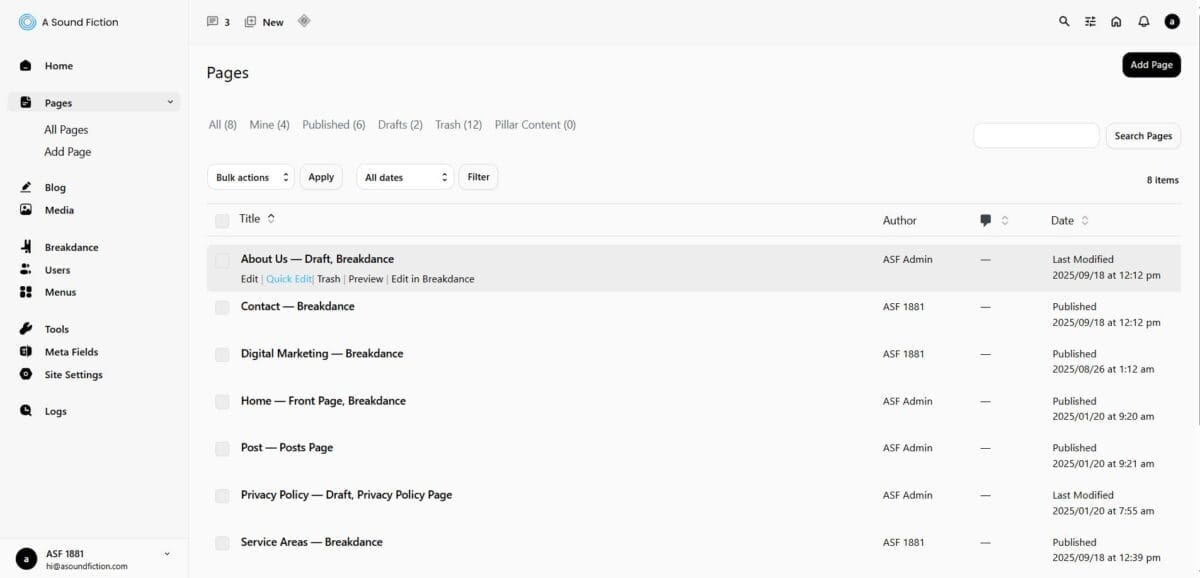When you hover your mouse over a page, you can use the options “Edit”, “Quick Edit”, “Trash”, “View”, and “Edit in Breakdance”.
