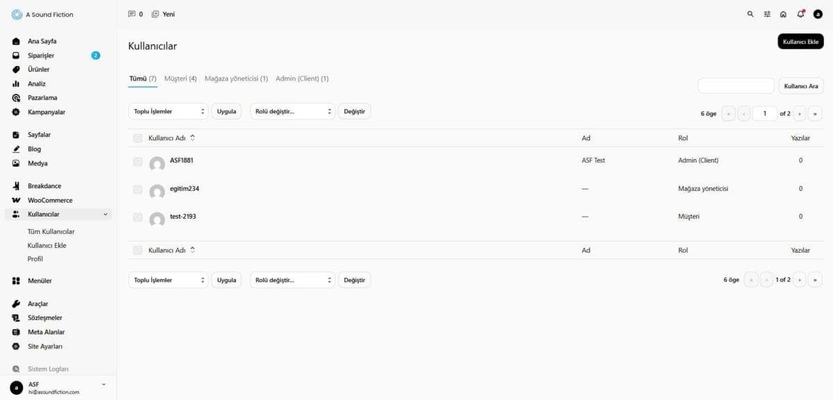 Kullanıcılar bölümü, sitenize kayıtlı olan tüm kullanıcıları görüntülemenizi, yönetmenizi, yeni kullanıcı eklemenizi sağlar.