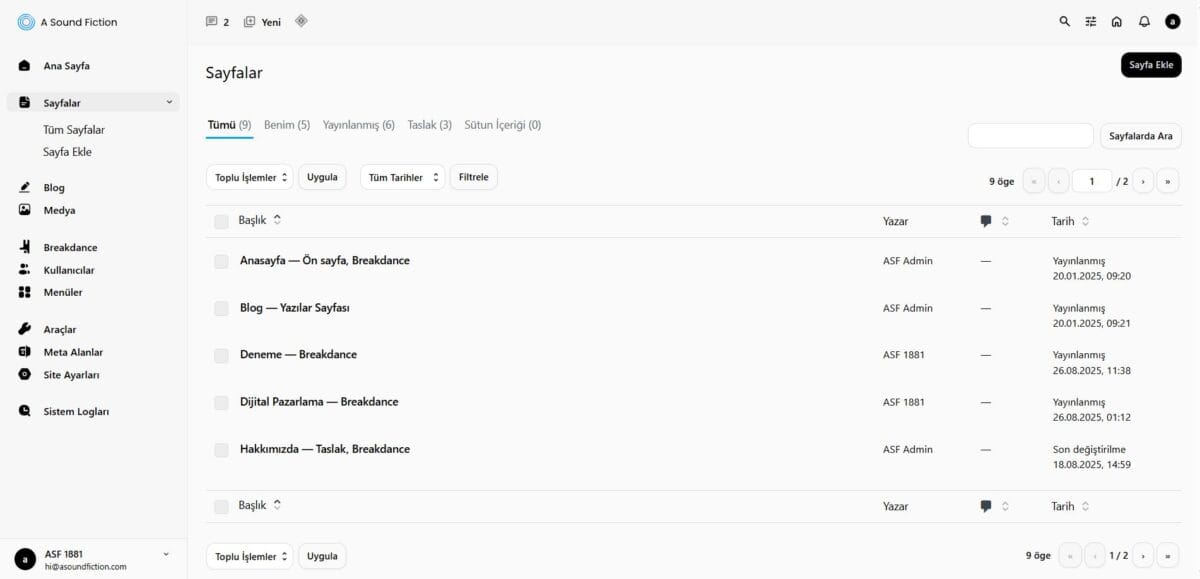 Admin Panelde sayfaları “Sayfalar“menüsünden görüntüleyebilir, düzenleyebilir veya yenilerini ekleyebilirsiniz. Blog ile karıştırılmamalıdır. Sayfalar sitenizin temel yapısını oluşturur, Blog (Yazılar) ise düzenli olarak paylaşılan güncel içerikler ve haberler içindir.